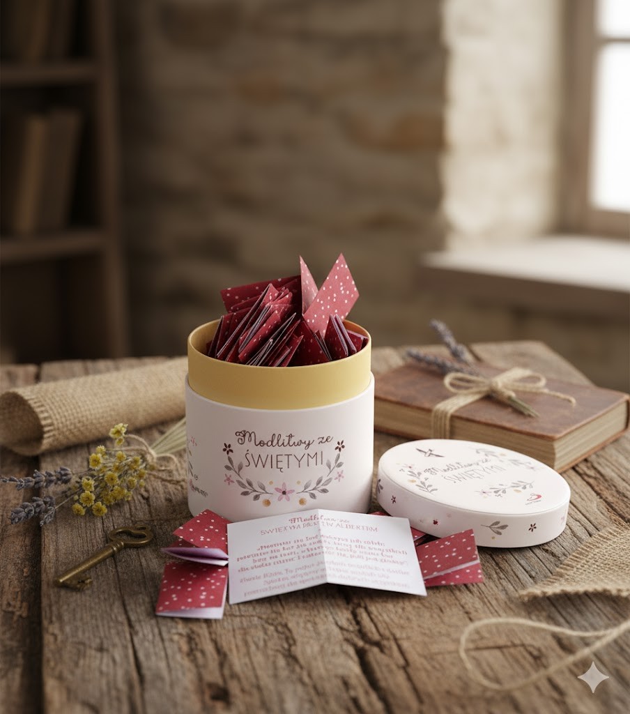 Dzięki poręcznemu formatowi pudełko możesz mieć zawsze przy sobie – w torebce, plecaku, na biurku czy przy łóżku. To idealny sposób, by w każdej chwili znaleźć słowa modlitwy, inspirację lub duchowe wsparcie.