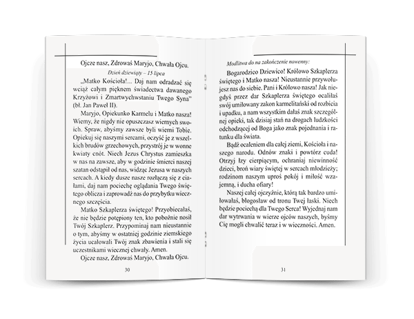 Modlitewnik przygotowany specjalnie dla czcicieli Matki Bożej Szkaplerznej, nazywanej też Matką Bożą z góry Karmel. Szymon Stock, przełożony generalny zakonu karmelitów, wielokrotnie błagał on Maryję o ratunek dla zakonu. W nocy z 15 na 16 lipca 1251 r. ujrzał Matkę Bożą, która podała mu szkaplerz, mówiąc: „Oto znak zbawienia, ratunek w niebezpieczeństwach, przymierze pokoju i wiecznego zobowiązania”. Modlitewnik do Matki Bożej Szkaplerznej zawiera m.in. modlitwy zawierzenia, litanię, koronkę i nowennę.
