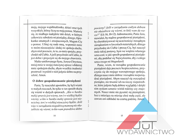 Niniejszy modlitewnik przeznaczony jest dla osób zmagających się z problemami materialnymi, mających wśród bliskich ludzi, którzy nie są zaradni finansowo, czy też dla wszystkich, którzy chcą się modlić w intencji tych, którym jest szczególnie trudno. Pozycję opatrzyliśmy modlitwami o pracę, w problemach materialnych, czy też modlitwami w innych, szczegółowych intencjach.