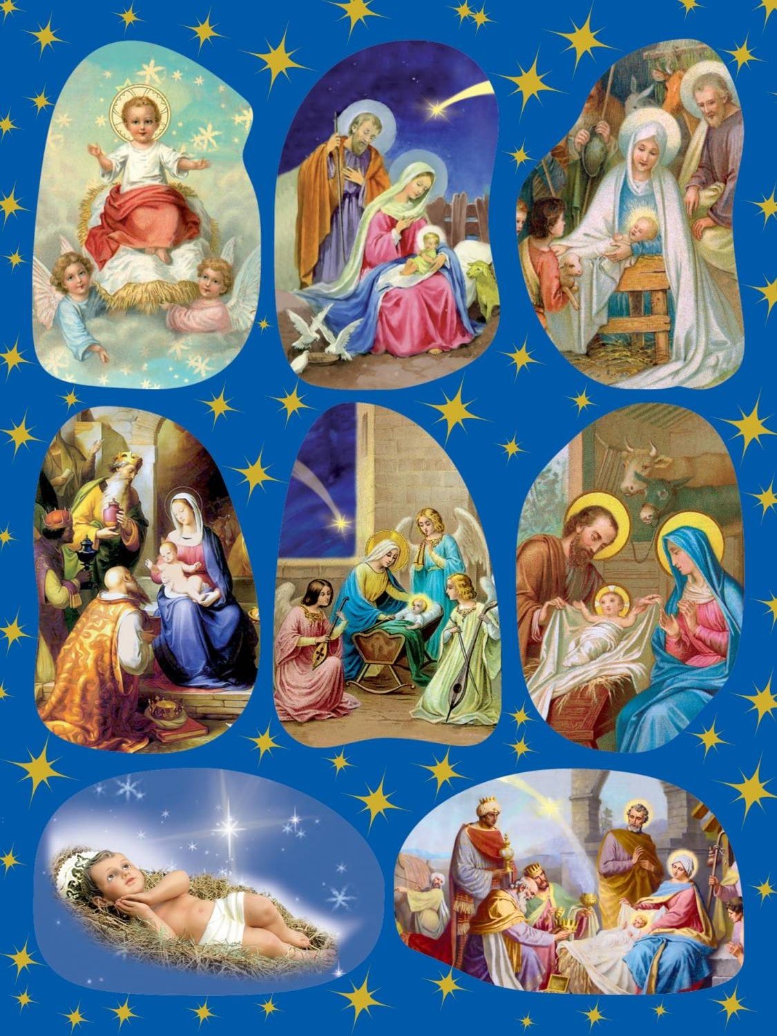 Wyjątkowy arkusz bożonarodzeniowych naklejek samoprzylepnych, przedstawiających najpiękniejsze sceny z narodzin Jezusa: Świętą Rodzinę, Dzieciątko w żłóbku, pokłon Trzech Króli oraz aniołów czuwających nad Nowonarodzonym. Każda naklejka została wykonana na papierze wysokiej jakości, z trwałym i wyraźnym nadrukiem o nasyconych, żywych barwach – tak, aby od razu przyciągała wzrok i wprowadzała świąteczny klimat.