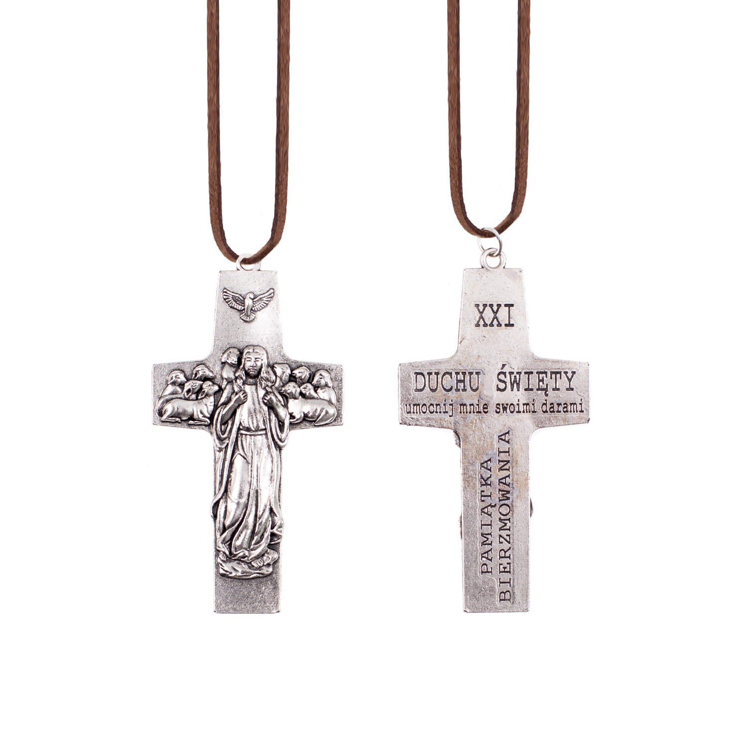 Krzyż metalowy, wytłoczone napisy: XXI DUCHU ŚWIĘTY umocnij mnie swoimi darami PAMIĄTKA BIERZMOWANIA. Rzemyk w zestawie.