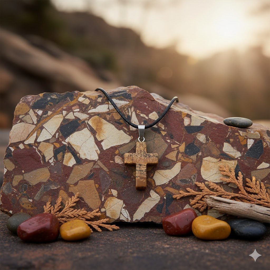 Elegancki naszyjnik z krzyżykiem wykonanym z naturalnego kamienia – jaspisu, łączy prostą formę z ponadczasową symboliką chrześcijańską. Krzyż jest znakiem wiary, nadziei i duchowej obecności Boga w codziennym życiu, a naturalna struktura kamienia sprawia, że każda zawieszka ma niepowtarzalny wygląd.