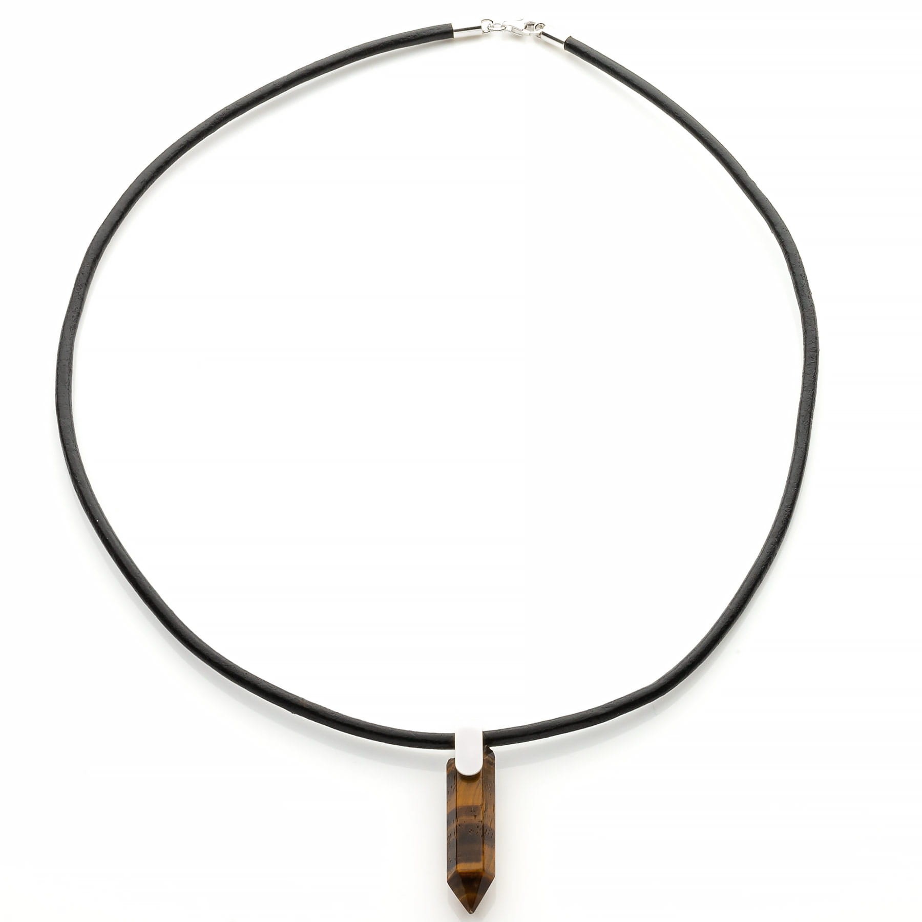 Męski naszyjnik, którego bazą jest skórzany, woskowany rzemień o grubości 3mm, w kolorze czarnym. Grot Gavbari wykonany z półszlachetnego kamienia Tygrysie oko, mieniącego się barwami złota, karmelu i różnych odcieni brązu. Naturalne Tygrysie oko można łatwo rozpoznać po połyskujących pasmach, przypominających te na sierści dzikiego kota. Kamień zawdzięcza swoją nazwę niezwykłemu efektowi optycznemu – w blasku słońca Tygrysie Oko lśni i migocze, a połyskujące jasne pasmo przemieszcza się podczas poruszania kamieniem. Grot o długości ok 3 cm i szerokości 0,8 cm wykończony został prostym krawatem wykonanym ze srebra pierwszej próby 925, podobnie jak zapięcie i zakończenie rzemienia. Produkt wykonany ręcznie w Polsce. Opakowanie wliczone jest w cenę.