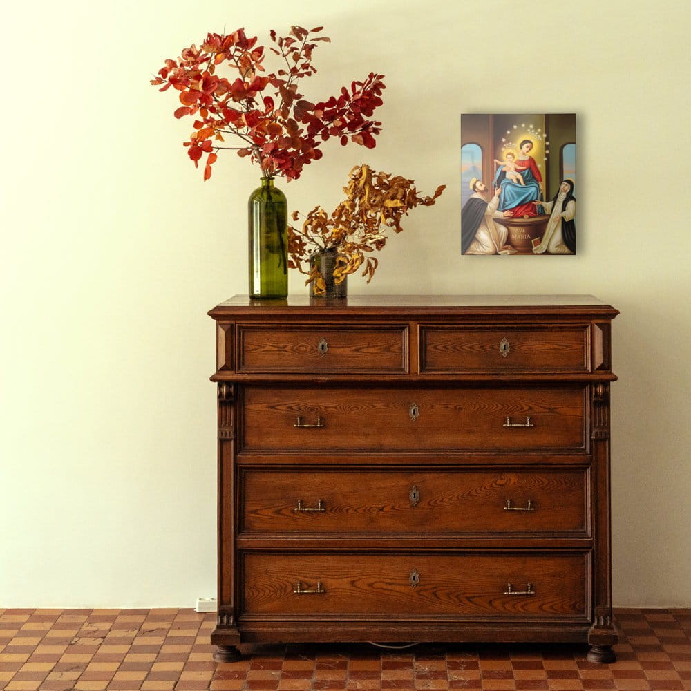 Dzięki estetycznemu wykończeniu obraz na desce lipowej nie wymaga dodatkowej oprawy a swoją formą przypomina ikonę. Obraz na drewnie może stanowić niezwykły upominek na każdą okazję: zarówno jako podarunek dla księdza lub siostry jak i z okazji Chrztu Świętego, Pierwszej Komunii Świętej, Bierzmowania czy Sakramentu Małżeństwa.