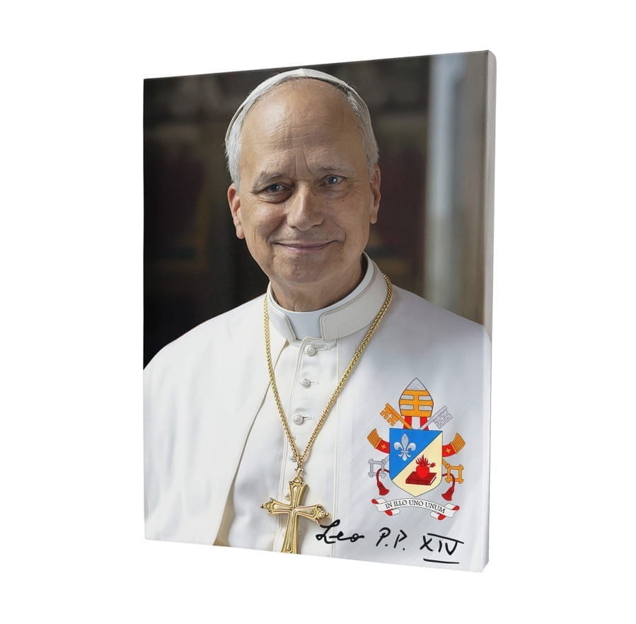 Ten portret papieża Leona XIV na płótnie to nie tylko efektowna ozdoba, ale także świadectwo nowego rozdziału w historii Kościoła. Wizerunek przedstawia papieża z jego osobistym herbem, na którym widnieje symbol płonącego serca zakonu augustianów, oraz łacińskie motto: „In Illo Uno Unum” – „W Jedynym – Jedność”.