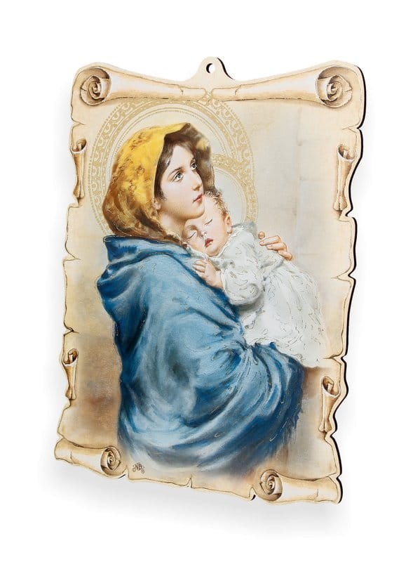 Wykonany na drewnianej deseczce, obrazek posiada delikatne złocenia.