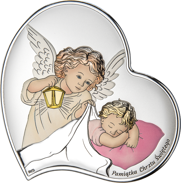 Obrazek srebrny - ANIOŁEK Z LATARENKĄ NAD DZIECIĄTKIEM – RÓŻOWY - 11x11 cm