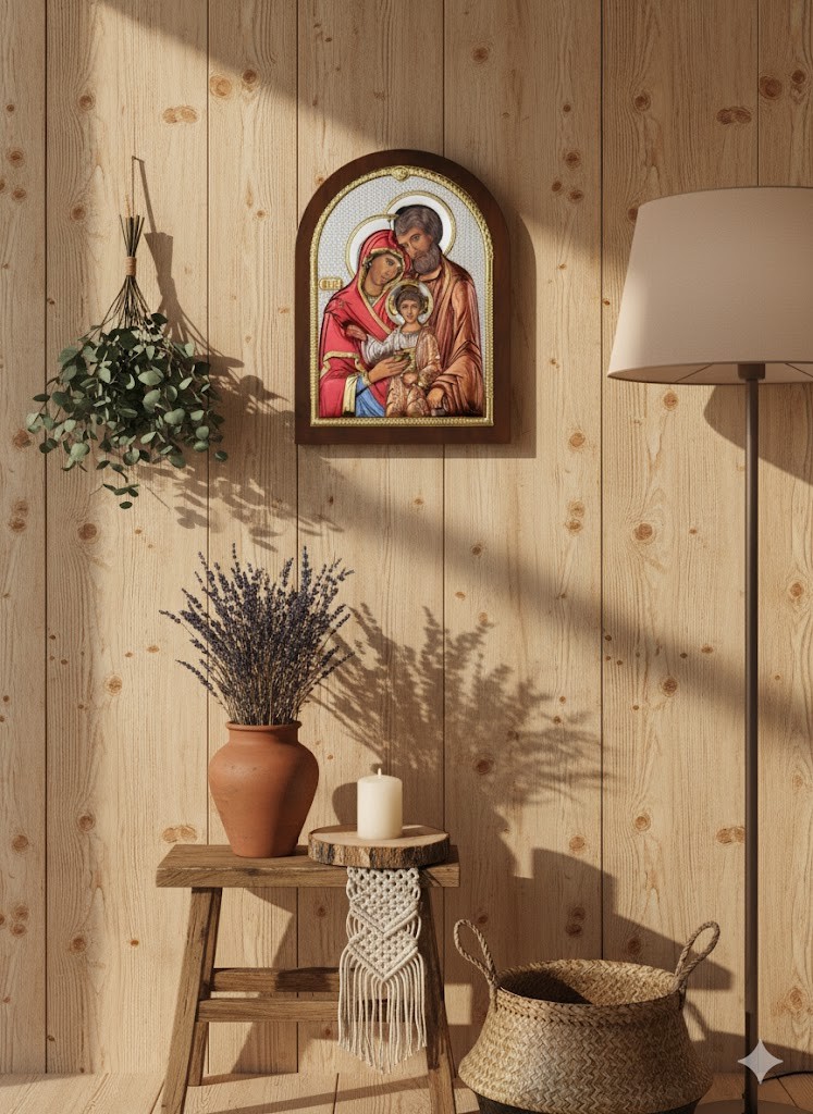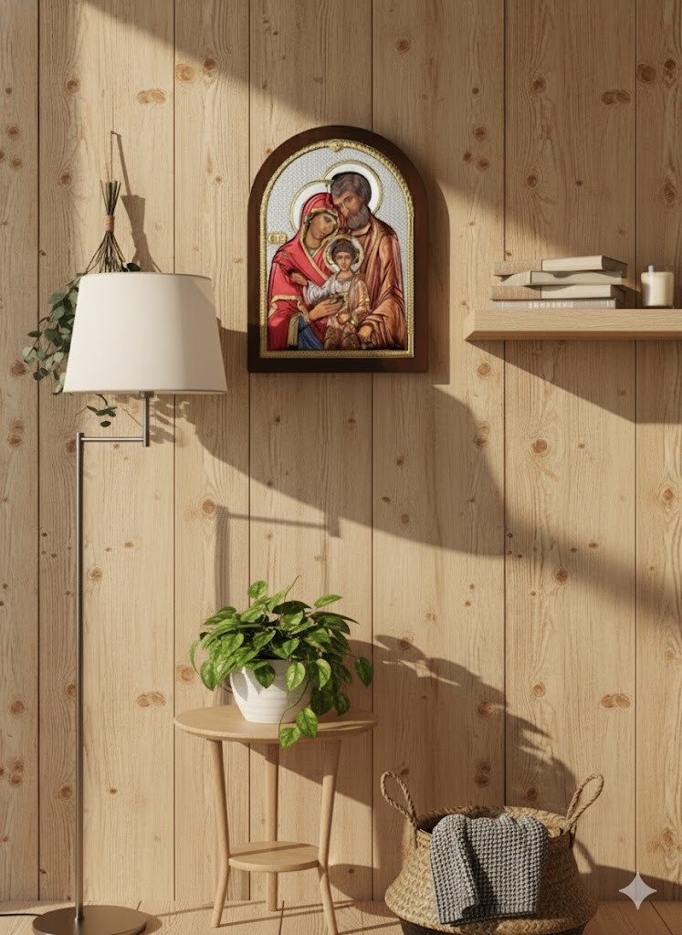 Ikona Świętej Rodziny przypomina o miłości, jedności i obecności Boga w codziennym życiu rodziny. Przedstawia Maryję, Józefa i Dzieciątko Jezus jako wzór wiary, zaufania i wzajemnej troski. To symbol pokoju domowego, błogosławieństwa oraz duchowej więzi, która łączy bliskich w Bożej opiece.