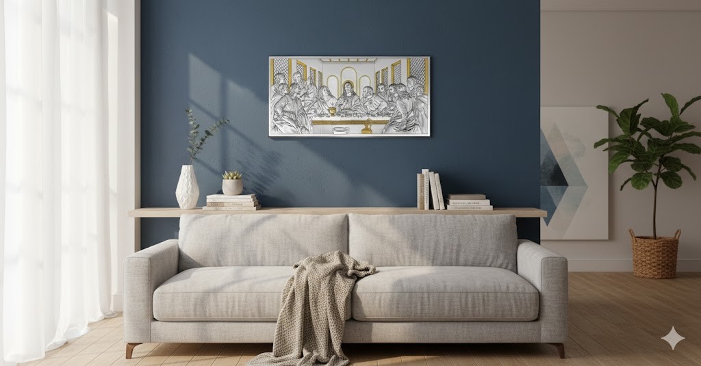 Obrazek „Ostatnia Wieczerza” przypomina Eucharystię jako źródło życia duchowego i wspólnoty. Srebro symbolizuje czystość i trwałość, natomiast złocenia podkreślają godność oraz świętość chwili. Taka dekoracja w domu staje się codziennym przypomnieniem o sakramencie, modlitwie i obecności Chrystusa.