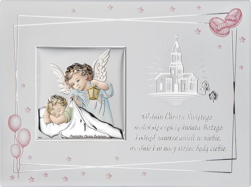 Obrazek srebrny z wizerunkiem Anioła Stróża i tłoczonym napisem: Pamiątka Chrztu Świętego