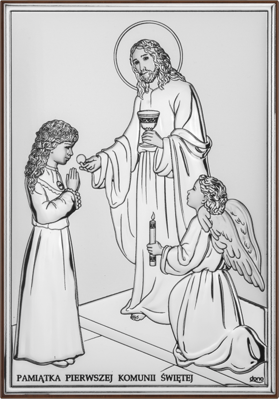 Srebrny obrazek przedstawiający scenę udzielania Pierwszej Komunii Świętej przez Jezusa to wyjątkowa i symboliczna pamiątka tego ważnego wydarzenia. Kompozycja ukazuje Chrystusa podającego Hostię modlącej się dziewczynce, w obecności anioła trzymającego świecę – symbol światła wiary i Bożej opieki. Klasyczna forma oraz subtelne srebrne wykończenie nadają obrazkowi elegancki i ponadczasowy charakter.