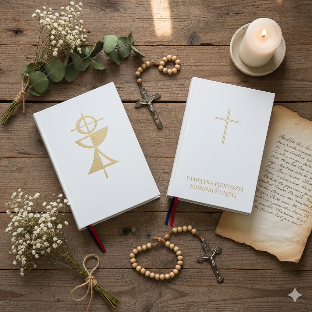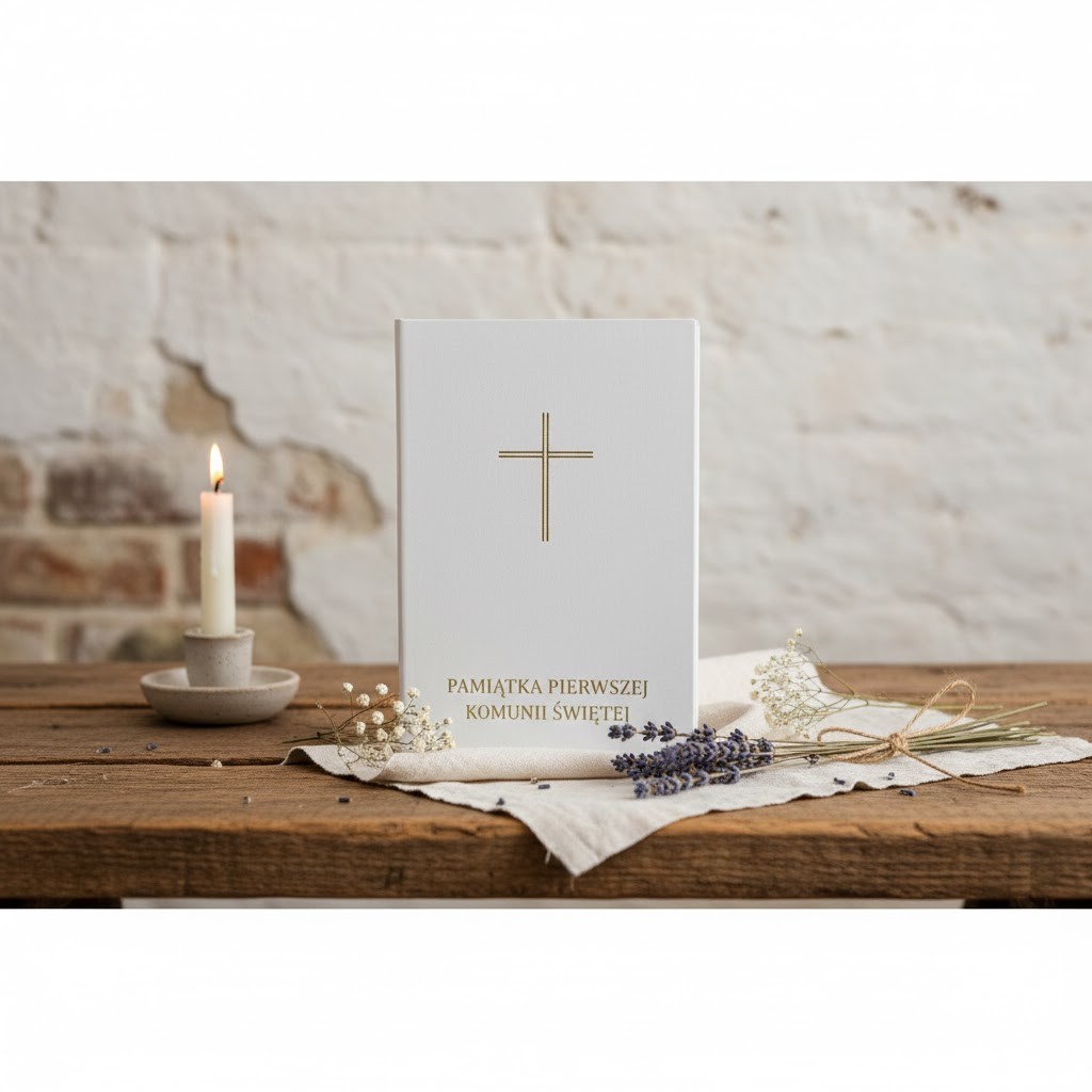 Biel oznacza czystość serca i radość, którą niesie sakrament Eucharystii. Złoty krzyż w środku okładki przypomina o obecności Chrystusa w życiu dziecka i o Jego prowadzeniu. Razem tworzą harmonijną całość — delikatną, elegancką i pełną duchowego sensu.
