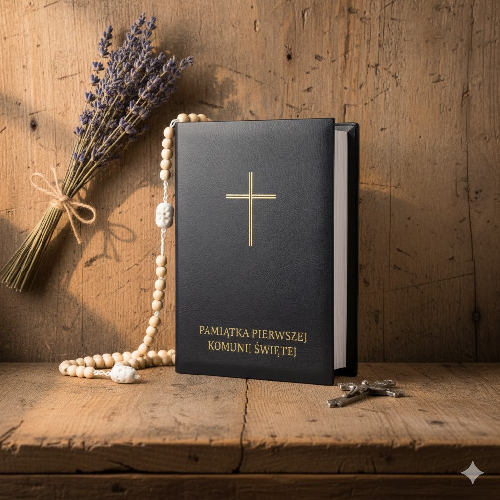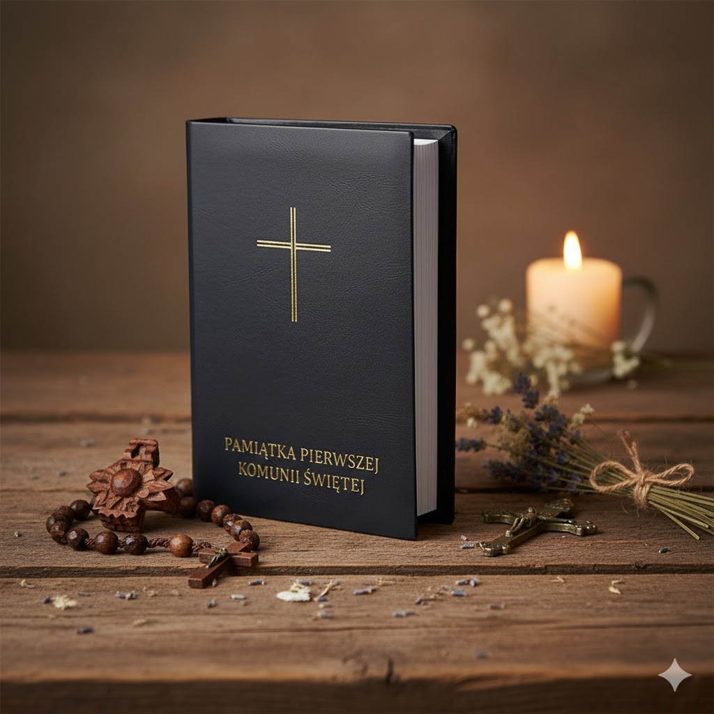 Złoty krzyż na okładce przypomina o obecności Chrystusa i duchowej drodze, którą rozpoczyna dziecko przyjmujące Pierwszą Komunię Świętą. Okładka staje się nie tylko praktycznym zabezpieczeniem, ale także subtelną pamiątką jednego z najważniejszych sakramentów w życiu wiary.