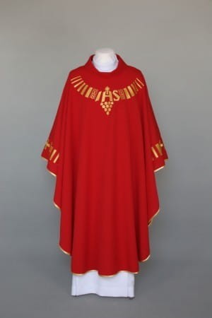 Ornat zdobiony nowoczesnym haftem, wykonany z lekkiej, przewiewnej tkaniny.