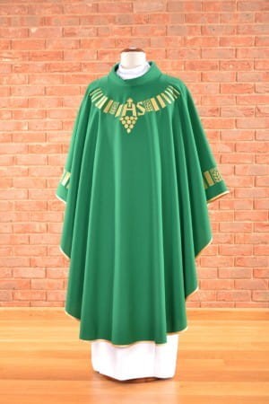 Ornat zdobiony nowoczesnym haftem, wykonany z lekkiej, przewiewnej tkaniny.