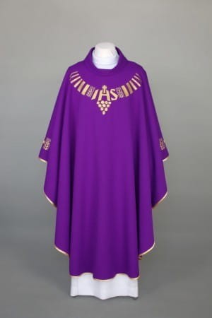 Ornat zdobiony nowoczesnym haftem, wykonany z lekkiej, przewiewnej tkaniny.