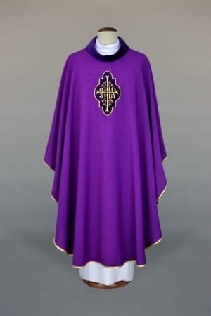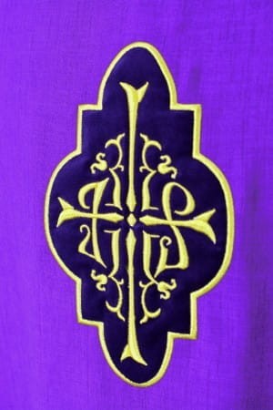 Ornat z haftami na aksamitnych aplikacjach, wykonane z lekkiej, przewiewnej tkaniny.