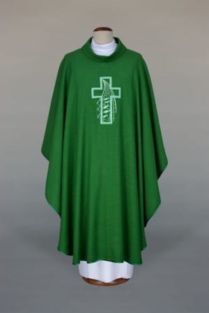Ornat haftowany, wykonany z lekkiej, lnianej tkaniny.