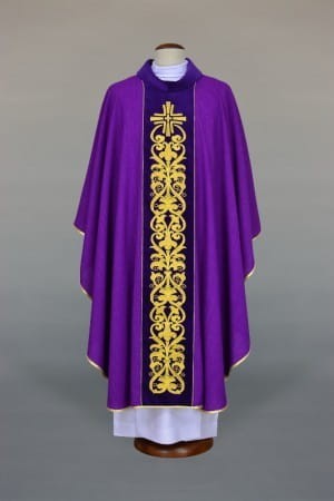 Ornat z bogatymi haftami na aksamitnym pasie, wykonany z lekkiej, przewiewnej tkaniny.