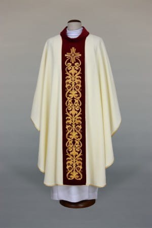 Ornat z bogatymi haftami na aksamitnym pasie, wykonany z lekkiej, przewiewnej tkaniny.