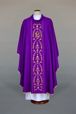 Ornat zdobiony haftami, wykonany z lekkiej, przewiewnej tkaniny.