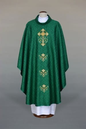 Ornat haftowany, wykonany z ozdobnej, adamaszkowej tkaniny.