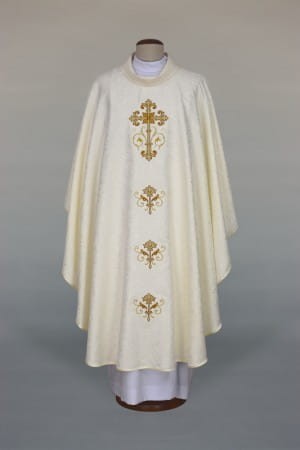 Ornat haftowany, wykonany z ozdobnej, adamaszkowej tkaniny.