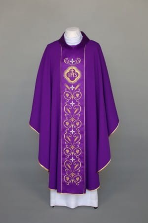 Ornat zdobiony bogatymi haftami na atłasowym pasie, wykonany z lekkiej, przewiewnej tkaniny.