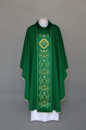 Ornat zdobiony bogatymi haftami na atłasowym pasie, wykonany z lekkiej, przewiewnej tkaniny.