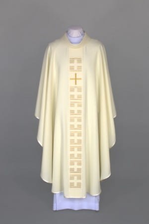 Ornat zdobiony nowoczesnym haftem, wykonany z lekkiej, przewiewnej tkaniny.