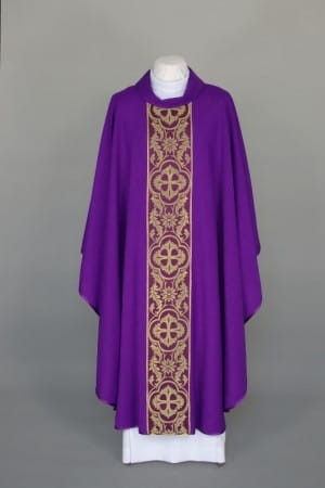 Ornat zdobiony nowoczesnym haftem, wykonany z lekkiej, przewiewnej tkaniny.