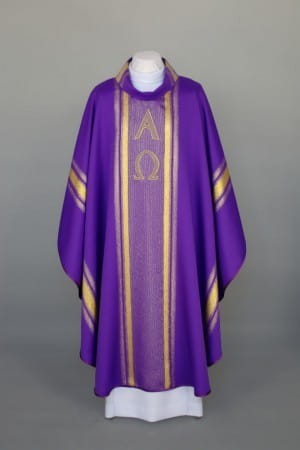 Ornat haftowany, wykonany z ozdobnej tkaniny ze złotymi pasami.
