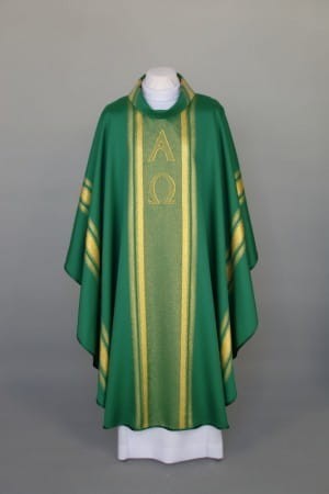 Ornat haftowany, wykonany z ozdobnej tkaniny ze złotymi pasami.