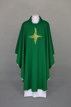 Ornat zdobiony nowoczesnym haftem, wykonany z lekkiej, przewiewnej tkaniny.