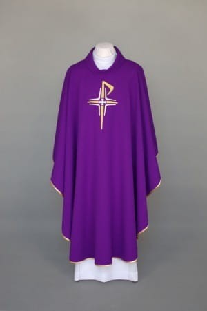 Ornat zdobiony haftem, wykonany z lekkiej, przewiewnej tkaniny.