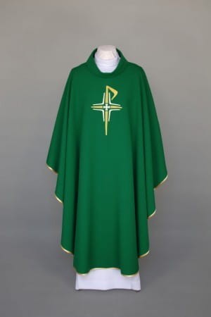 Ornat zdobiony nowoczesnym haftem, wykonany z lekkiej, przewiewnej tkaniny.