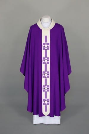 Ornat wykonany z lekkiej, przewiewnej tkaniny, zdobiony haftowanym pasem.