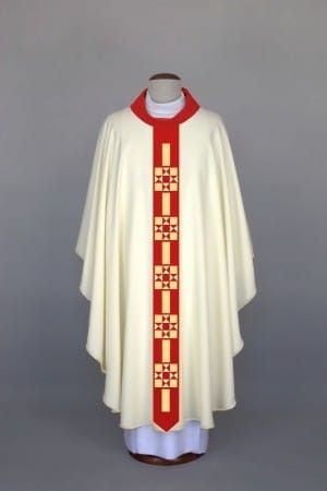Ornat wykonany z lekkiej, przewiewnej tkaniny, zdobiony haftowanym pasem.