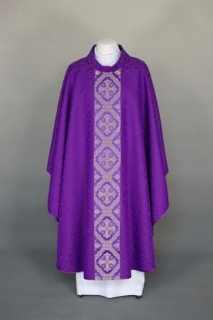 Ornat wykonany z adamaszkowego materiału, zdobiony tkanym pasem.