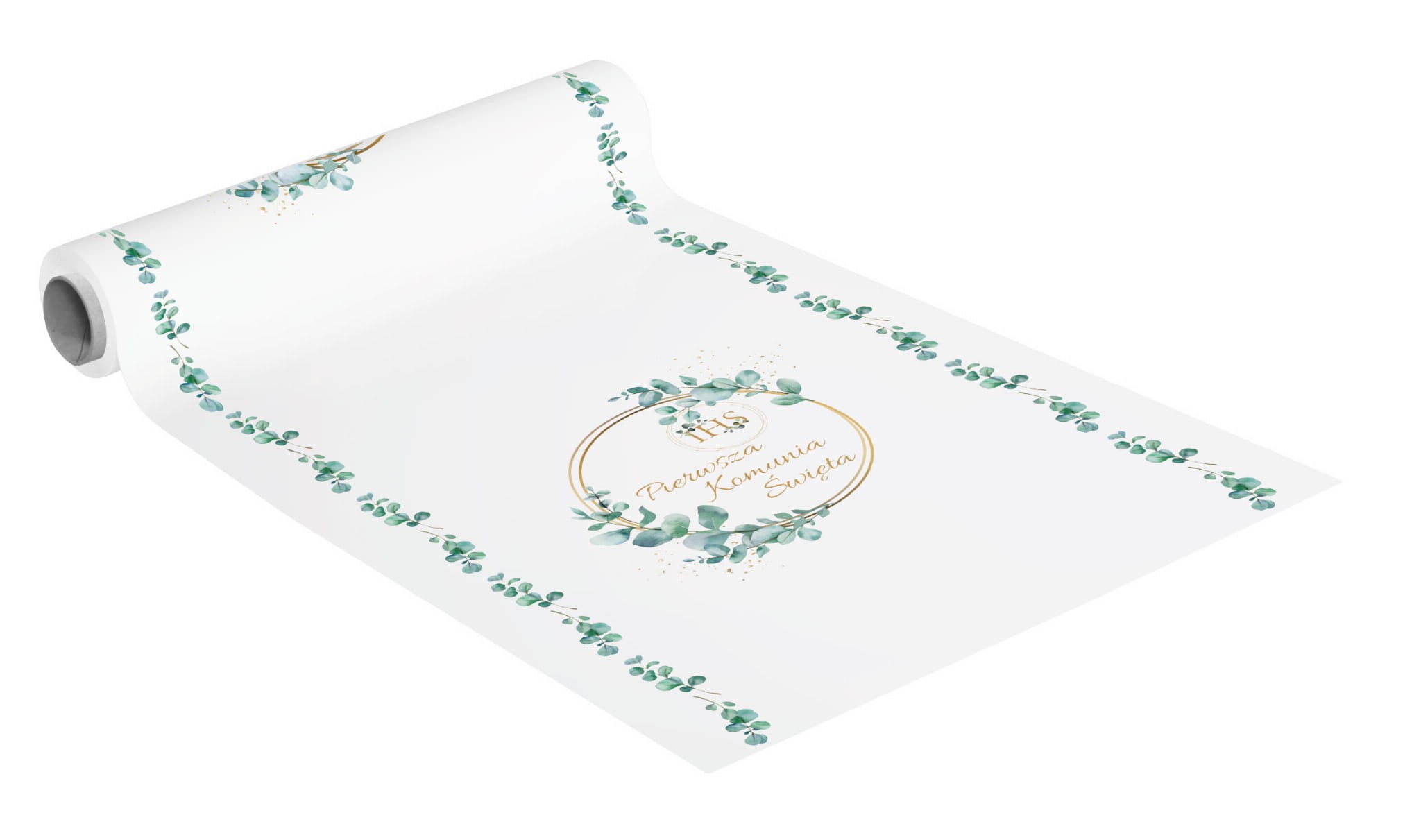 Ozdobny bieżnik do dekoracji stołu na Pierwszą Komunię Świętą. Bieżnik umieszczony na rolce pozwala na łatwe ułożenie go na stole. Fantastycznie sprawdzi się jako dekoracja zarówno dla chłopca jaki dziewczynki.
