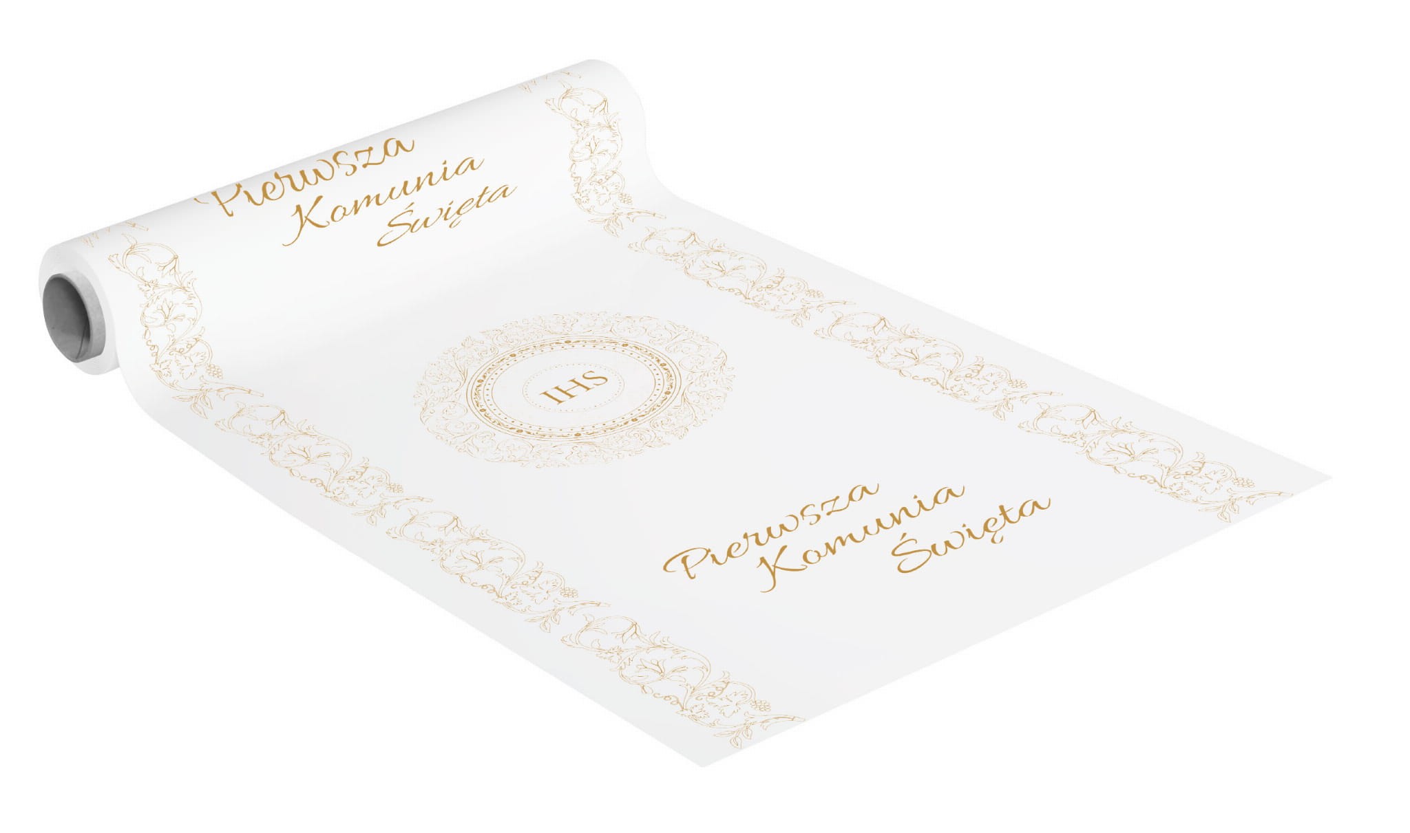 Ozdobny bieżnik do dekoracji stołu na Pierwszą Komunię Świętą. Bieżnik umieszczony na rolce pozwala na łatwe ułożenie go na stole. Fantastycznie sprawdzi się jako dekoracja zarówno dla chłopca jaki dziewczynki.