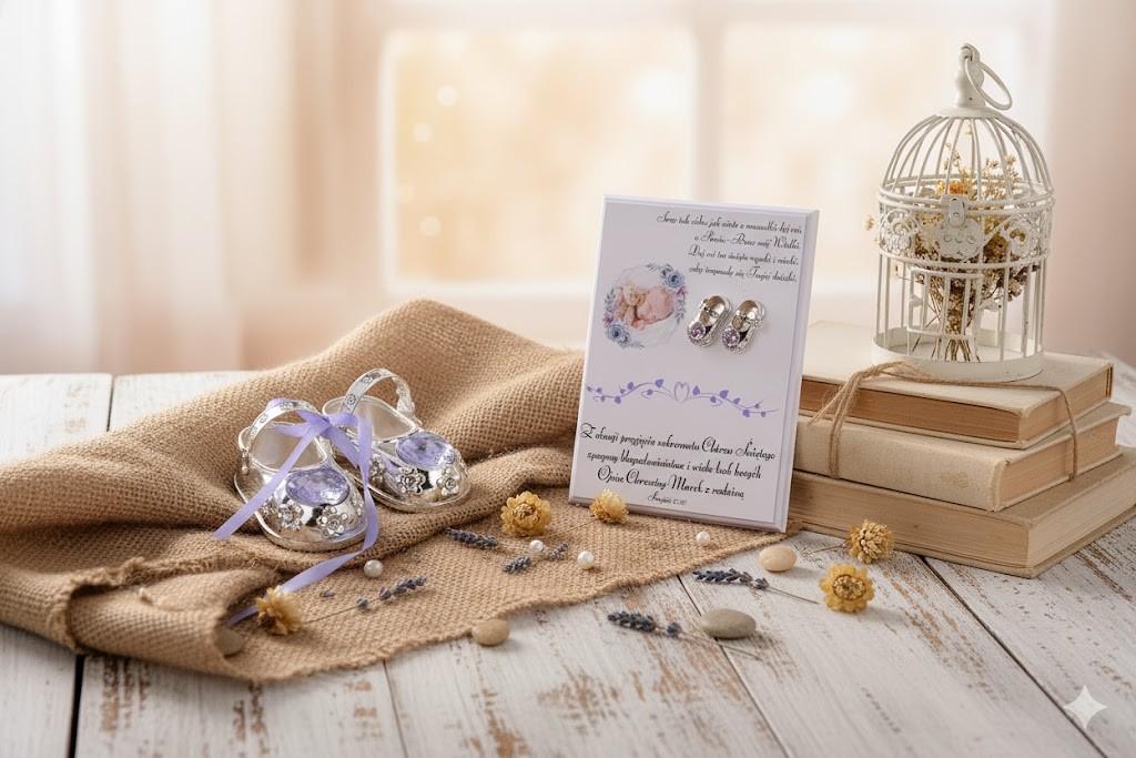 Delikatne buciki Swarovski nadają całości elegancji i wyrafinowanego blasku. Dzięki możliwości personalizacji imienia, daty oraz dedykacji, pamiątka staje się jedyna w swoim rodzaju — pełna ciepła, pamięci i indywidualnego znaczenia. To prezent, który pięknie wybrzmi zarówno podczas uroczystości, jak i później, stojąc w pokoju dziecka lub w rodzinnej przestrzeni modlitwy.