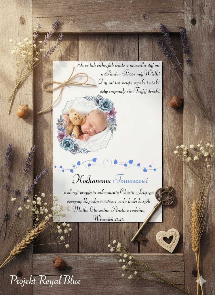 Chrzest Święty jest pierwszym i najważniejszym sakramentem — momentem, w którym dziecko zostaje wprowadzone do rodziny Kościoła. Pamiątka z imieniem przypomina o tej duchowej chwili, o modlitwie i miłości rodziny oraz o obecności Boga, która towarzyszy człowiekowi od samego początku jego życia.