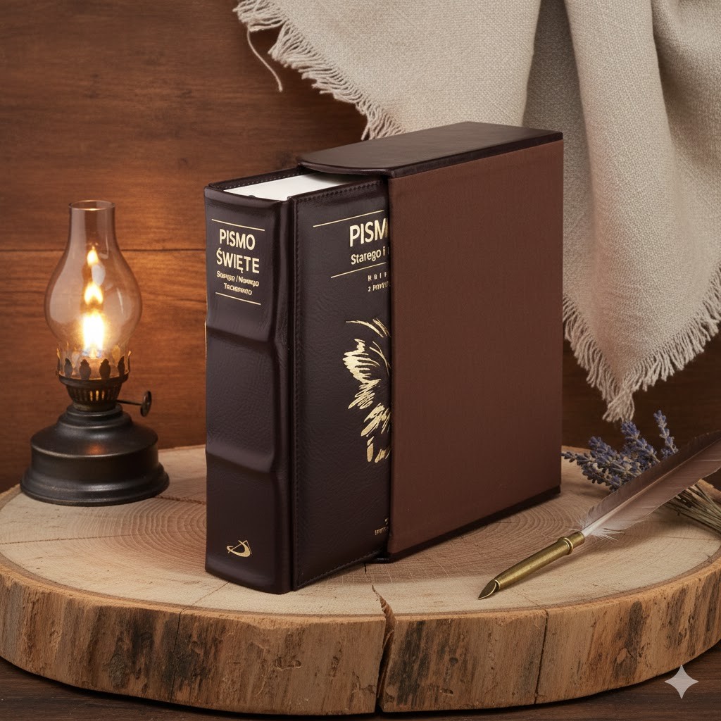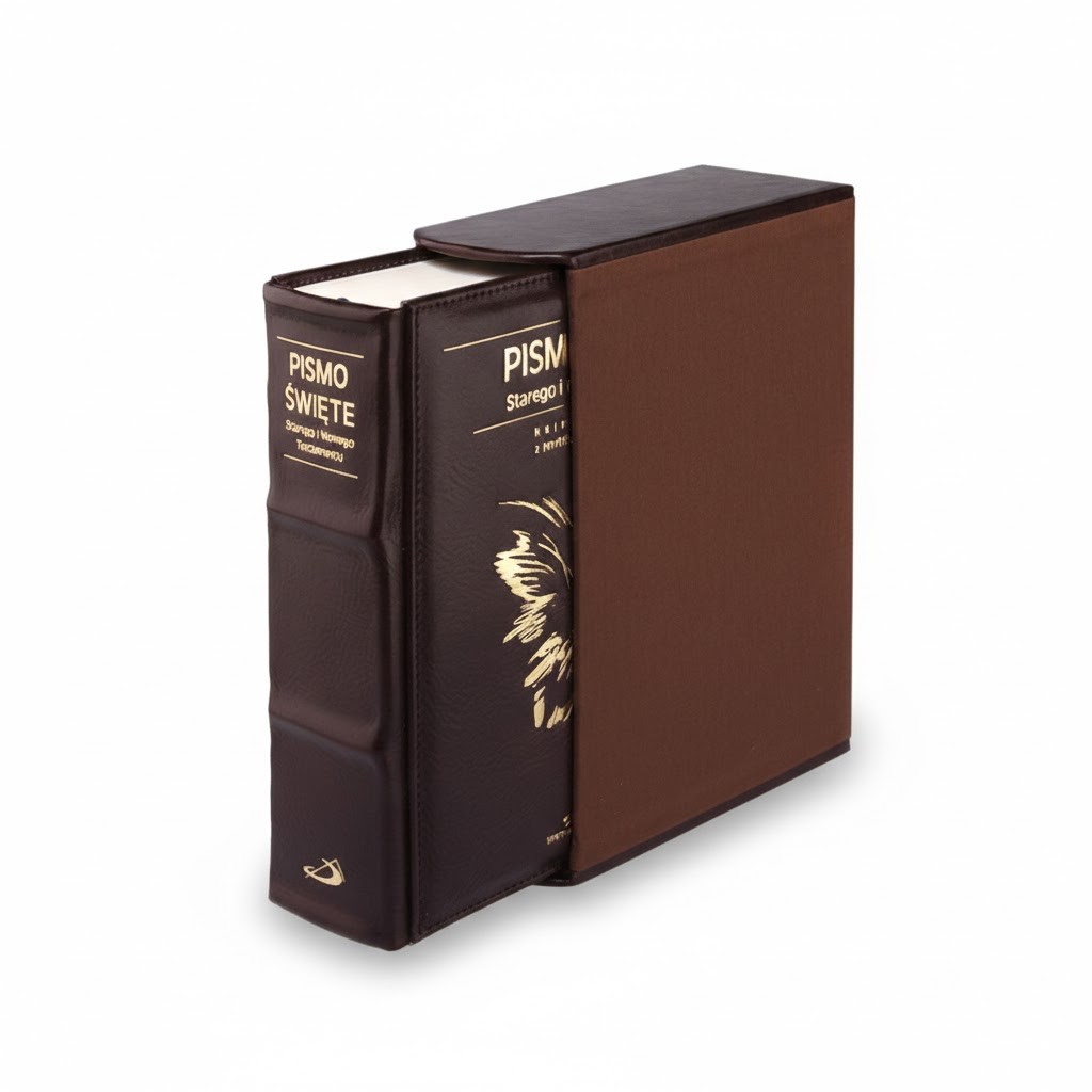 Egzemplarz wyróżnia się piękną, bordową oprawą z litej skóry naturalnej, wykończoną złoceniami, które nadają mu ponadczasowej elegancji. Twarda oprawa jest trwała i odporna na zużycie, dzięki czemu Pismo doskonale nadaje się do wieloletniego użytkowania. W komplecie znajduje się również dopasowane etui, chroniące księgę w biblioteczce lub w czasie podróży.