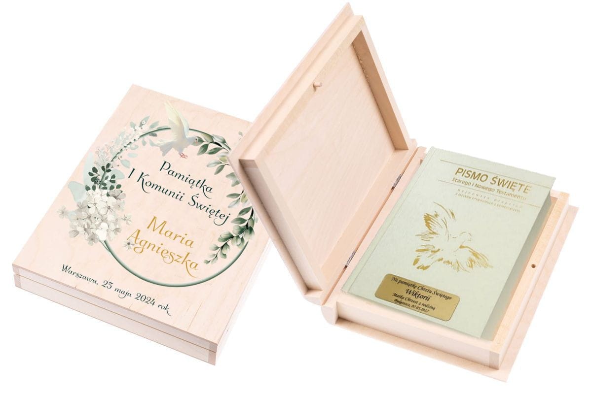Pismo Święte w pudełku drewnianym EKO ♻ nadruk UV - Pamiątka I Komunii Świętej