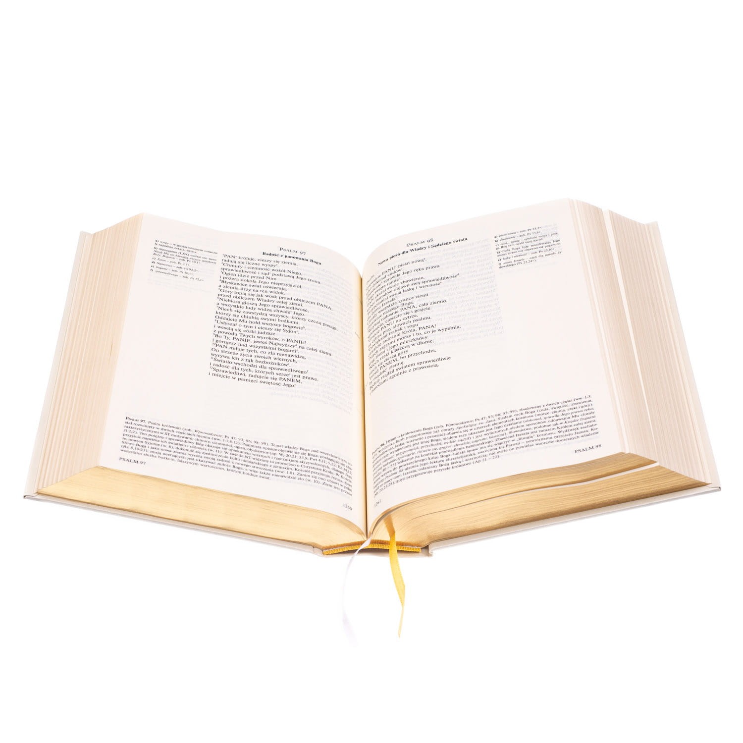 Wewnątrz znajduje się Pismo Święte Wydawnictwa Święty Paweł – najnowszy przekład z komentarzem, opracowany przez Zespół Biblistów Polskich z inicjatywy Towarzystwa Świętego Pawła. To pierwsze tłumaczenie Biblii powstałe w trzecim tysiącleciu – idealne do codziennego użytku i rodzinnego czytania.