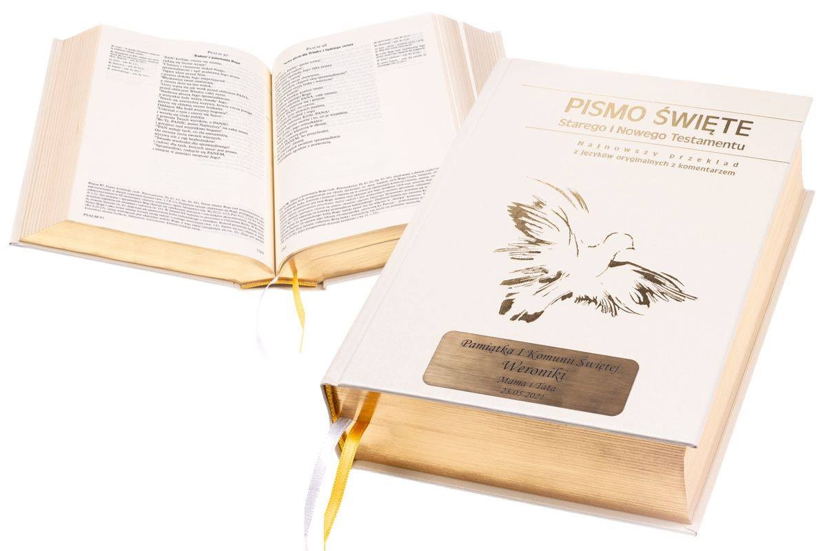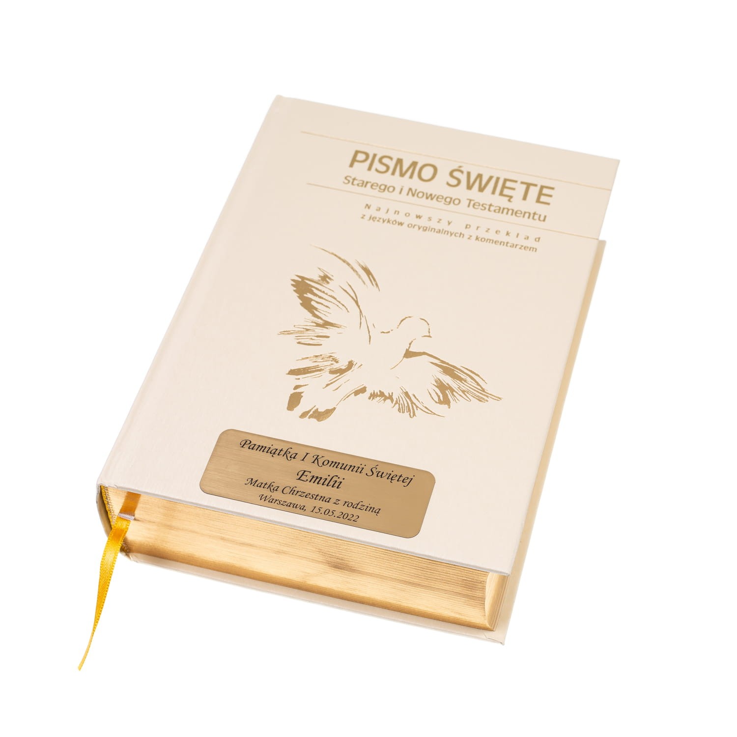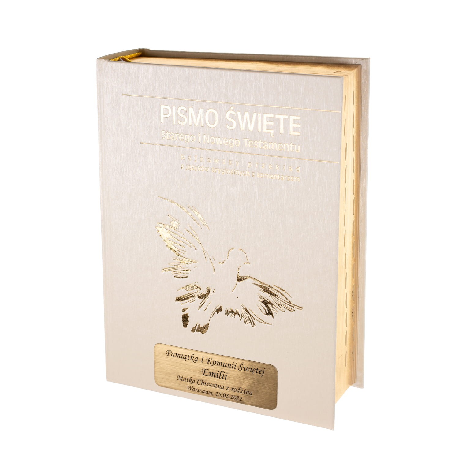 Pismo Święte ze złoceniami w pudełku drewnianym EKO ♻ nadruk UV - Pamiątka I Komunii Świętej