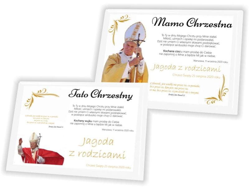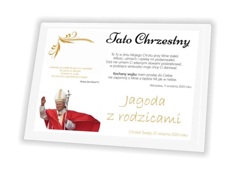 Proponujemy Państwu wyjątkowe podziękowanie z motywem Św. Jana Pawła II patrona rodzin, które będzie niezapomnianym i niezwykle trwałym prezentem dla Rodziców Chrzestnych by odwdzięczyć się za okazaną miłość i wsparcie, które będą trwać przez lata.