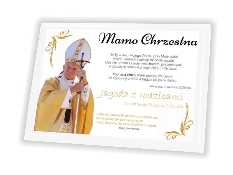 Projekt dla Mamy Chrzestnej lub Taty Chrzestnego z wizerunkiem św. Jana Pawła II oraz podziękowaniem w formie wiersza "To Ty w dniu mojego Chrztu przy mnie stałaś/eś, miłość, uśmiech i opiekę mi ofiarowałaś/eś. Dziś nie potrafię Ci własnymi słowami podziękować, w podzięce serduszko moje chce Ci podarować. Kochana ciociu/wujku, ja prośbę mam do Ciebie, nie zapomnij o mnie a będzie mi jak w niebie".