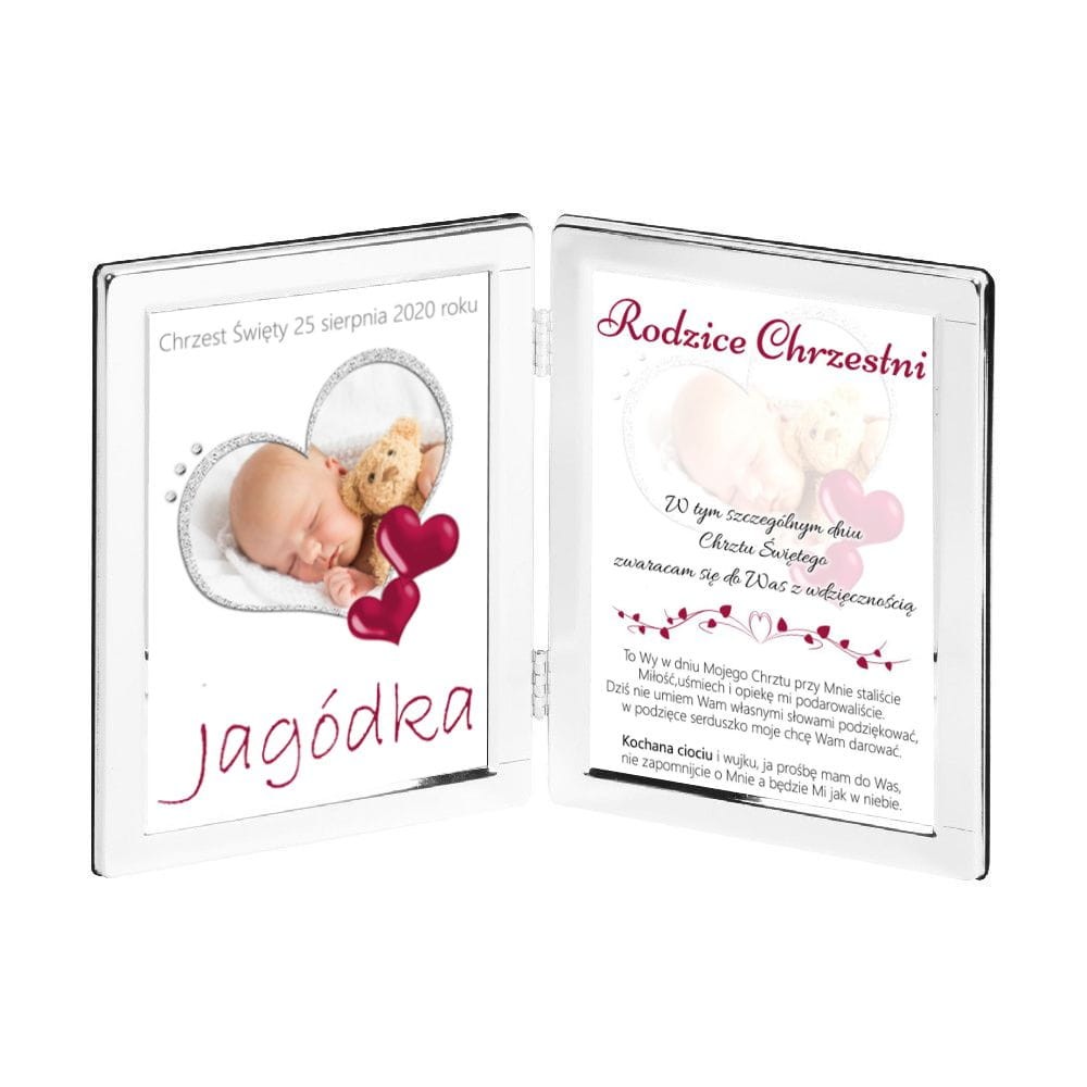 Projekt z indywidualnym nadrukiem i zdjęciem chrzczonego dziecka "To Ty w dniu mojego Chrztu przy mnie stałaś/eś, miłość, uśmiech i opiekę mi ofiarowałaś/eś. Dziś nie potrafię Ci własnymi słowami podziękować, w podzięce serduszko moje chcę Ci podarować. Kochana ciociu i wujku, ja prośbę mam do Ciebie, nie zapomnij o mnie a będzie mi jak w niebie".